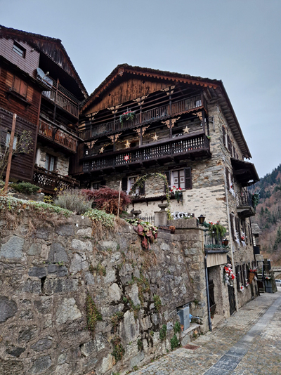 Scesi dall’altra parte, passando accanto al ristorante La Crüggia dal Punt, ci siamo di nuovo inoltrati per le stradine fra le casette di pietra, abbiamo chiacchierato con un signore gentile che stava rientrando in casa, e che sperava in una bella nevicata, anche se “non sono più come quelle di una volta”, e poi con l’anziano artigiano del legno, il signor Ernesto, che nonostante la stanchezza per la sua età ci ha mostrato le sue creazioni di legno intagliato a mano.