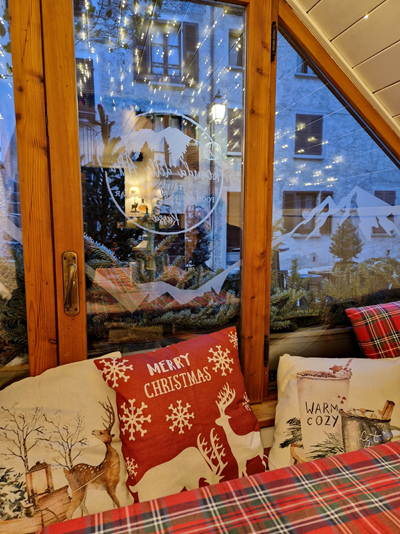 Dopo aver girovagato per il borgo, mentre il freddo aumentava per l’approssimarsi della sera, siamo quindi tornati alla Locanda delle Alpi e ci siamo rintanati nel suo angolino più bello, quello vicino alla finestra, con le panche, i cuscini natalizi e le lucine. Una gioia per gli occhi! Caffè, cioccolata con la panna, croissant, e il mio compagno un’ottima grappa del posto per rallegrare ulteriormente la giornata.