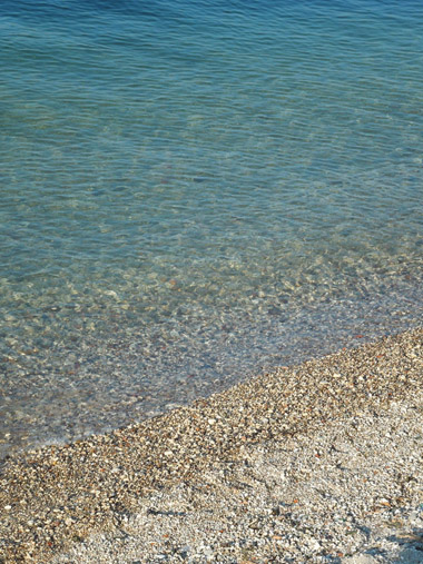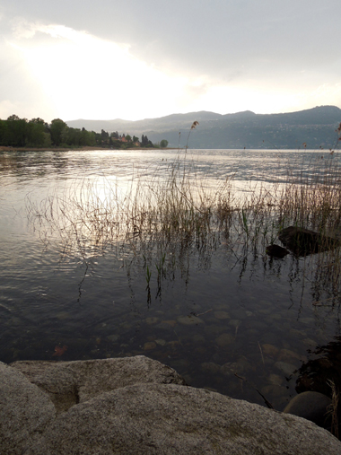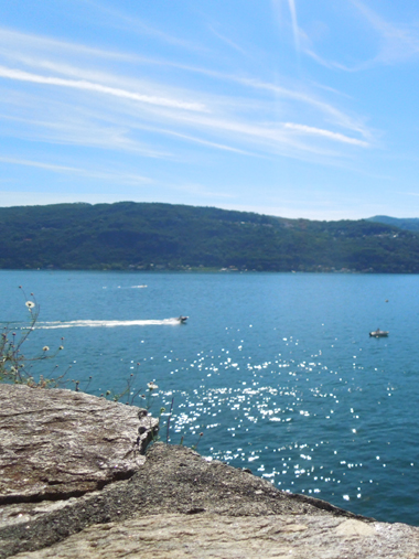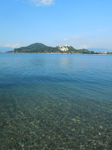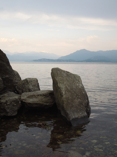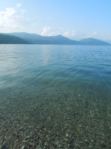 Poi, sono scesa alla riva del lago e mi sono lasciata incantare dalle limpide trasparenze dell’acqua e dai bellissimi colori che sfumano dai blu, agli azzurri, ai verdi, alle tinte chiare e calde dei sassolini che scivolano e rotolano dolcemente insieme al ritorno delle piccole onde, così delicate e gentili rispetto a quelle del mare.