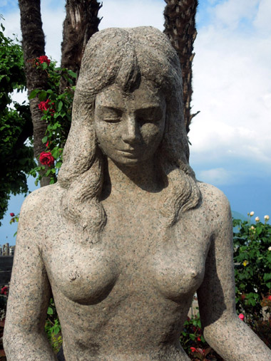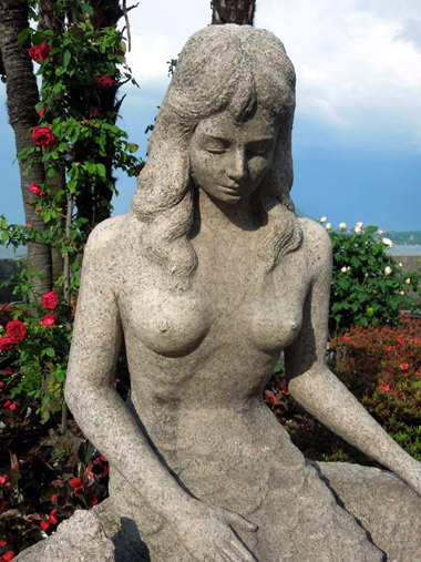 Lei veglia il lago, sicura, immobile, con lo sguardo fisso sulle acque, e spinge a guardare nella stessa direzione, nel profondo azzurro che talvolta si tinge di toni cupi e minacciosi, quando il vento e la pioggia agitano le onde ed è più necessaria e invocata la sua protezione.