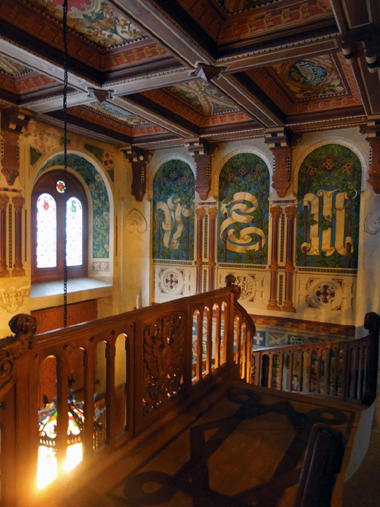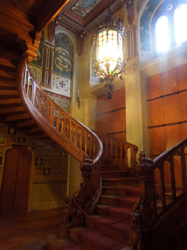 Le stanze interne del castello sono purtroppo quasi prive di arredamento, ma sono molto belle, soprattutto le numerose finestre, che offrono una vista incantevole sul bosco di abeti e sulle montagne circostanti, e la scalinata d’ingresso, col suo movimento serpentino e il suo lampadario coloratissimo.