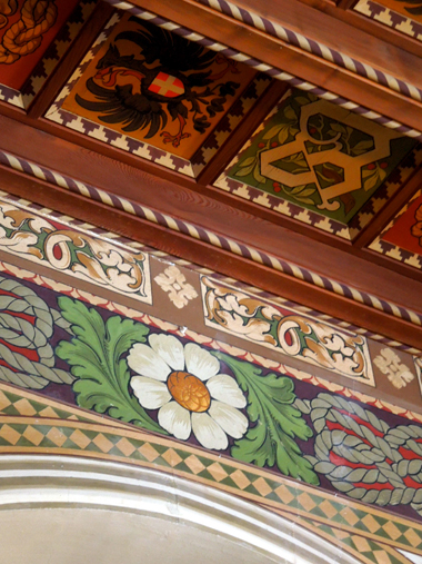 I soffitti a cassettoni, tutti dipinti e pieni di colori, si armonizzano con le decorazioni affrescate sui muri, e soprattutto con le tante, tantissime margherite – dal nome della Regina – che fioriscono dappertutto.