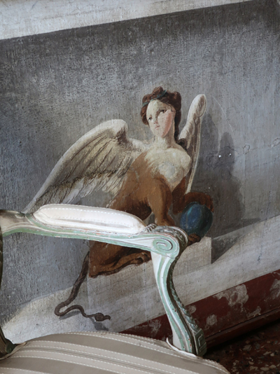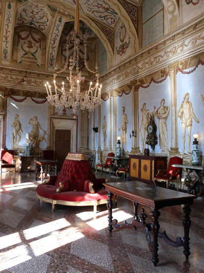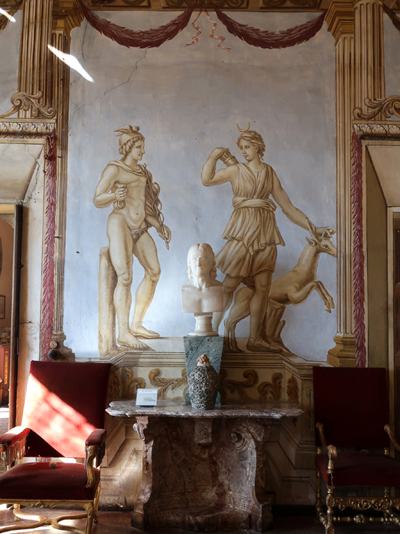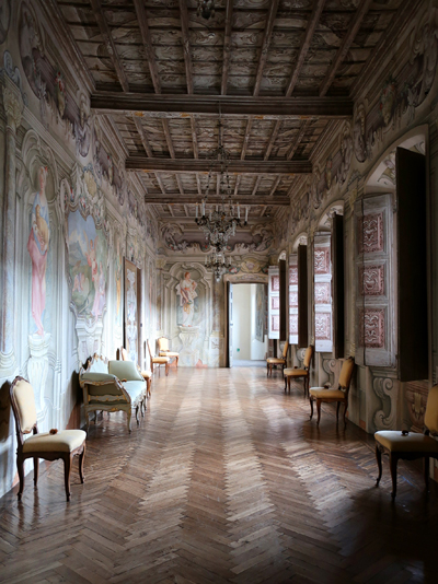L’interno è un suggestivo labirinto di stanze, scale e scalette, una favolosa galleria affrescata, illuminata da una luce morbida e velata, e da ogni finestra una emozionante vista sul parco.