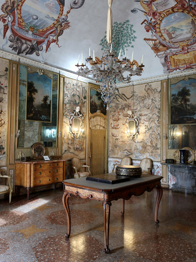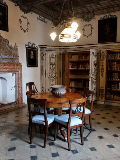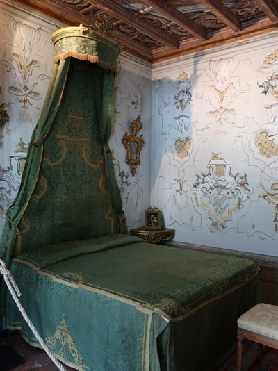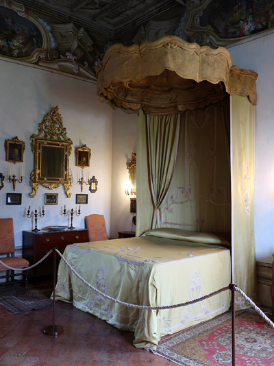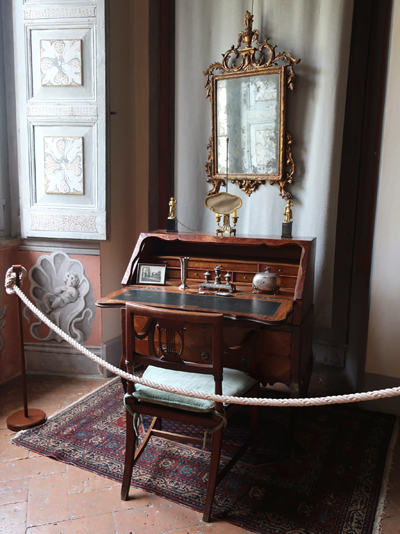 Le mie stanze preferite sono quella dei libri, con il tavolo e il camino, i soffitti a cassettoni, i colori caldi e accoglienti. Poi lo studio, imponente, con la gigantesca scrivania, e le camere da letto con i copriletto damascati verdi, una con la nicchia dalla luce soffusa, l’altra con lo scrittoio accanto alla finestra.