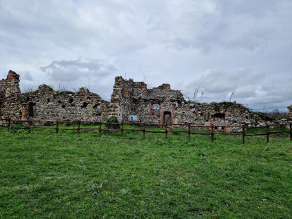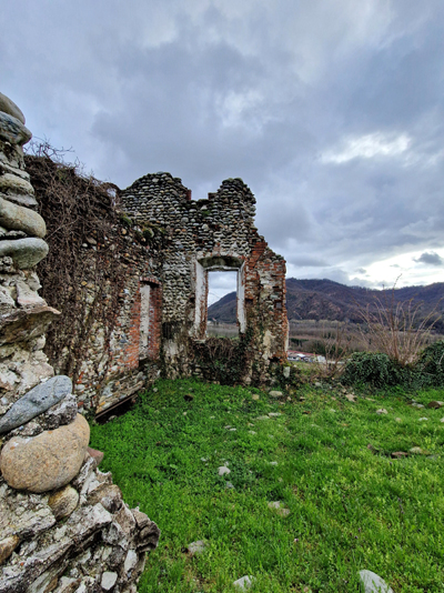 Per prima cosa abbiamo incontrato la torre, risalente all’XI secolo, più spoglia di come l’avevo vista in alcune fotografie nelle quali l’erba alta e alcuni alberi, di cui non c’era più traccia, la rendevano simile a un luogo fiabesco immerso nel verde e nel fogliame. Nuda e solitaria, non mi ha trasmesso ciò che speravo, ma una sua particolarità mi ha comunque affascinata. Non è ovviamente accessibile perché pericolante, ma anche se alla base è stata recentemente realizzata una porticina, in origine la sua sola e unica porta di accesso era a circa nove metri da terra, dove più tardi venne costruito il balconcino. Vi era un unico modo per accedervi dall’esterno: chi era all’interno doveva calare le trecce, o meglio, una lunga scala, che poi veniva ritirata al suo interno. La funzione della torre era infatti quella di avvistamento e protezione del luogo. Non vi abitava dunque Raperonzolo con la sua lunga chioma, e nemmeno la contessina Beatrice, ma guardie di protezione, forse poco fiabesche – anche se dipende dai punti di vista – ma quanto mai necessarie per la comunità intera.