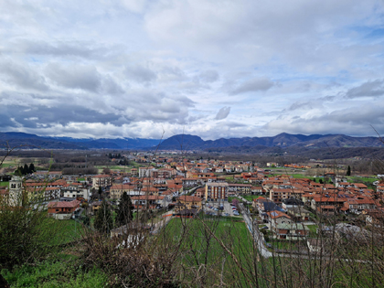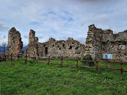 Lasciata la torre, ci siamo spostati verso le rovine del castello, passando accanto al suo oratorio, la ecclesia Sanctae Mariae de Supramonte, al cui interno sono presenti alcuni affreschi interessanti e la cui prima notizia risale al 1284. È probabile che il santuario originario sia sorto per cristianizzare un luogo dedicato a una divinità delle altezze, che venne assorbita da Santa Maria di Sopramonte. Spostandoci verso il limitare del pianoro, la vista che si apre sulla catena montuosa è bellissima. Davanti a tutti spicca il caro Monte Fenera, mentre una mappa dei monti posta sul limitare dello spazio recintato aiuta a riconoscere le vette più lontane.