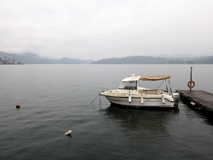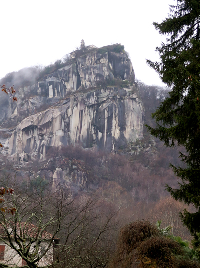 Raggiunta la sponda piovosa del lago, a Pella, volgendo lo sguardo verso le acque e i profili sfumati delle sponde opposte, semplicemente me la sono trovata davanti. Una montagna nebbiosa, con un profondissimo lago davanti, e una torretta sulla cima a ricordare proprio quella Avalon.