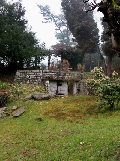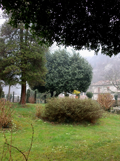 Nel giardino sono presenti alcuni alberi solitamente conosciuti allo stato di arbusti o siepi, che lasciati crescere si sono sviluppati in forme e dimensioni mai viste. Ricordo in particolare un albero di lauro ceraso, un cedro del Libano e un grande osmanto, sotto la pioggerella, con le foglie lucide e gocciolanti, immersi nel lieve canto d’acqua, sotto a una sporgenza di montagna impressionante.