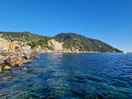 Siamo dunque partiti e ho imboccato la direzione Genova, con lo sguardo e il cuore ormai rivolti solo avanti. Il viaggio è stato piuttosto lungo, ma il momento in cui è apparso il mare, che non vedevo da tanti anni, è stato per me commovente. Credevo fosse una striscia di cielo più intensa, e invece, era lui. Ci siamo quindi fermati in un autogrill caro al mio compagno, che è subito diventato anche il mio preferito: subito dopo Masone, dove un’immensa pala eolica accarezza il vento. Dopo un caffè e una brioche abbiamo subito ripreso il viaggio, e dopo vari rallentamenti che lo hanno protratto più del previsto, siamo finalmente arrivati alla nostra prima tappa, sulla Riviera di Levante: la bellissima Camogli.