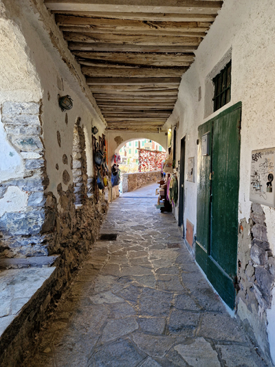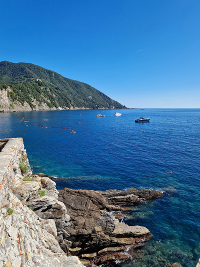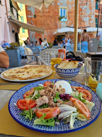 Dopo aver osservato a lungo il Castello della Dragonara, ed esserci immersi nel paesaggio incantevole che lo circonda, abbiamo convenuto che se non mangiavamo un boccone saremmo probabilmente deceduti lì, così siamo scesi nuovamente verso la spiaggia di scogli, dove i numerosi negozietti e locali marinari accoglievano in un tripudio di colori e profumi – e che profumi! Abbiamo scelto un posto carino in cui mangiare e ci siamo rilassati davanti a una insalatona leggera ma gustosa per me, e la tipica focaccia ripiena al formaggio – eravamo attaccati a Recco, dopotutto – per lui.