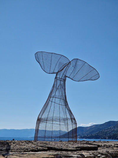 Lasciata la macchina, abbiamo sceso scalini su scalini fino ad arrivare alla passeggiata – bollente – sul mare. La stanchezza e il caldo, eccessivo in questo tratto di percorso, mi hanno molto provata, ma la frescura e l’ombra del ponte che si affaccia sul porto, piano piano, mi hanno riportata in vita. Così di lì a poco abbiamo ripreso l’esplorazione verso il vecchio faro, passando accanto alla ringhiera dove migliaia di cuoricini sono stati appesi dagli innamorati, e attraverso la bella galleria dei pescatori, fino a incontrare le particolari installazioni a coda di balena. Non amo l’arte moderna, ma queste le ho adorate.