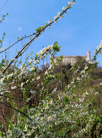 Per quanto la salita sia stata faticosa, mi sono fermata diverse volte solo per ammirare la bellezza del sentiero, degli alberi in fiore, del castello che svettava nel cielo azzurro e della vista sul paesaggio sottostante, con una splendida montagna azzurra coronata di neve.